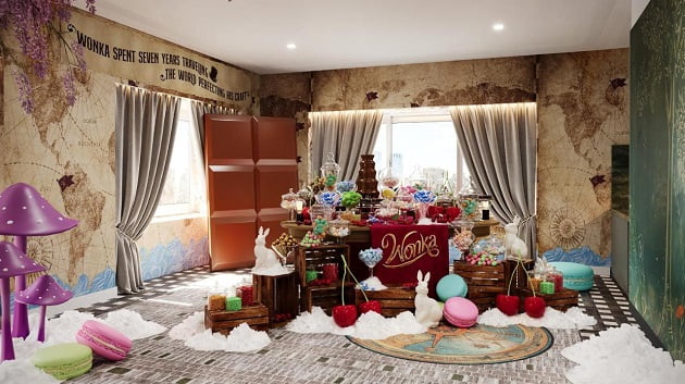 The booking site teases “all-you-can-treat experiences and edible amenities such as limited-edition, fun, and imaginative Wonka Magic Hat Gummies in four fruity flavored combinations, life-sized chocolate confections, a replica of the tree in Wonka’s candy shop, and a decadent chocolate bar bed topped with marshmallows set amidst cotton candy clouds for the sweetest dreams, like those in the new film.”