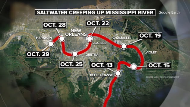 Jurisch lives about an hour south of New Orleans, but the saltwater is now moving up the Mississippi River and could reach the city as soon as Oct. 22, according to the Army Corps of Engineers.