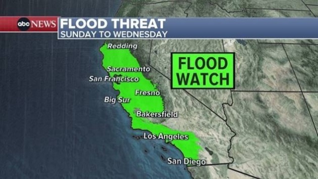 (NEW YORK)– An already drenched California is bracing for a second storm as a multiday atmospheric river is projected to bring rainfall, wind and snowfall to the Golden state Sunday and extend through Wednesday.
