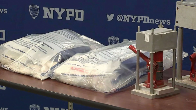 Police executed a search warrant and found more than 5 pounds of suspected cocaine with traces of fentanyl; more than 2 pounds of suspected heroin with traces of fentanyl; several guns, including a high-capacity rifle; and four kilo presses, the NYPD said.