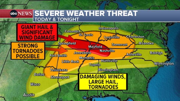 There is a moderate risk — 4 out of 5 on the severe scale — for an area from just east of Springfield, Missouri to Nashville, Tennessee with strong tornadoes possible there. They are also possible outside of this area with an enhanced risk of 3 out of 5, but this moderate risk is mainly for the increased risk for giant hail and destructive winds.
