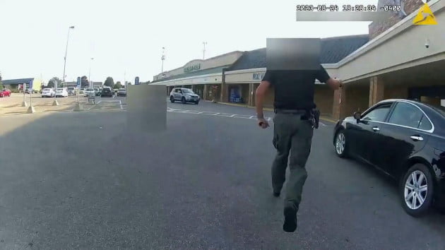 The officers announce “shots fired” as they chase the vehicle for several feet before it comes to a stop, video shows.