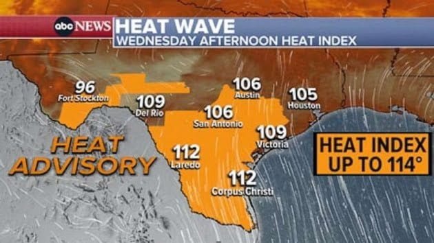 The heat index in Corpus Christi will reach 112 degrees by Wednesday afternoon, while San Antonio’s heat index is forecast to be 106 degrees.