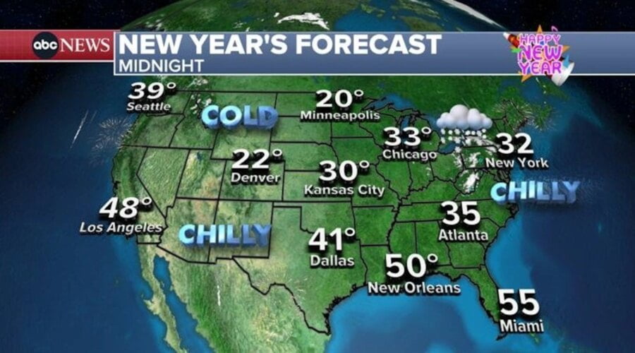 (NEW YORK) — As the holiday weekend starts, New York City ball drop watchers can expect potential showers while California’s coast is continuing to experience extremely dangerous beach conditions with dangerously large waves, life-threatening rip currents and coastal flooding.