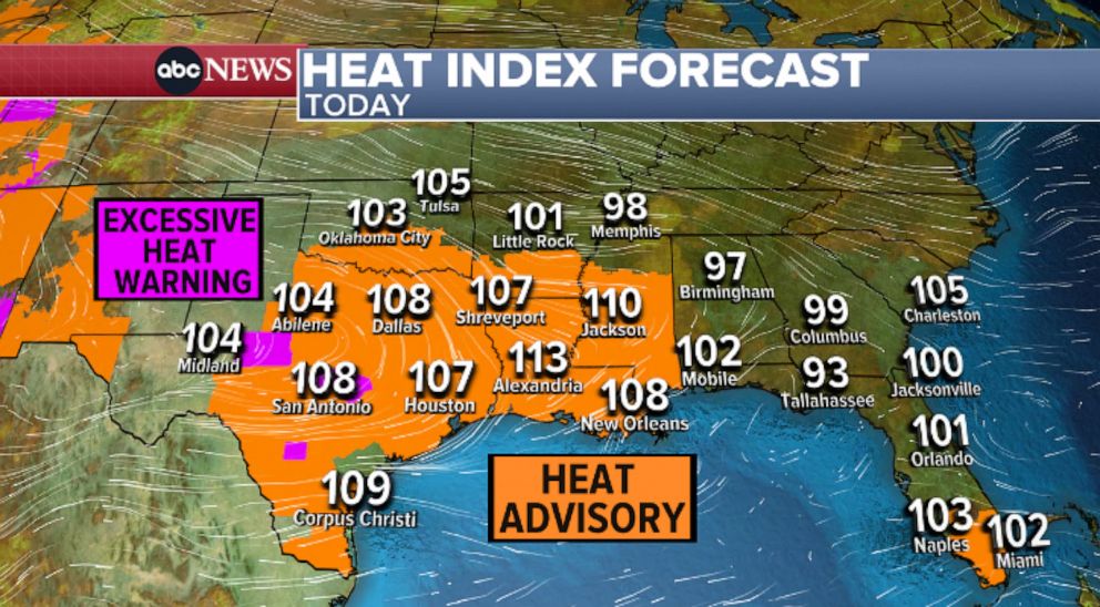 On Friday, the heat index — what the temperature feels like with humidity — is forecast to hit 108 degrees in Dallas, San Antonio and New Orleans; 110 degrees in Jackson, Mississippi; and 105 in Charleston, South Carolina.