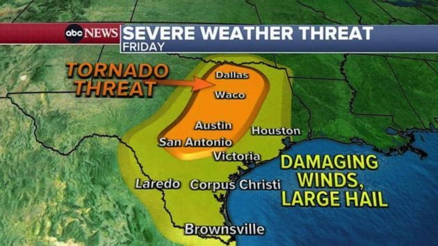 Damaging winds in excess of 75 mph, huge hail and tornadoes are possible. The highest tornado threat will be from Dallas to Waco Friday afternoon between 3 and 7 p.m. CT.