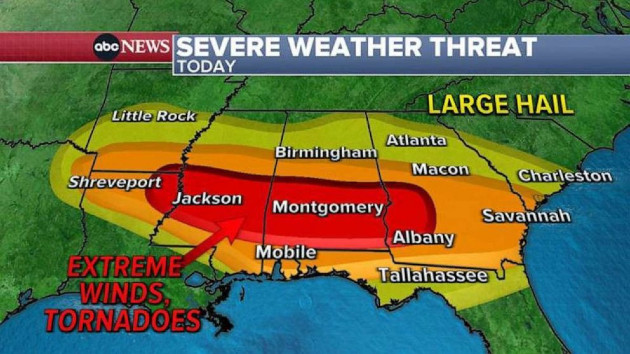 (NEW YORK) — The South is bracing for severe weather on Wednesday, including strong tornadoes, powerful winds and large hail.
