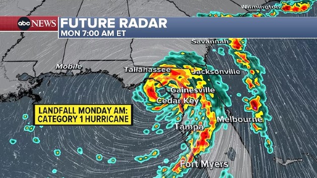 (NEW YORK) — Hurricane Debby is roaring across Florida as a Category 1 hurricane after making landfall Monday morning.