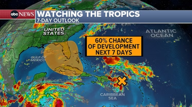 There’s a 20% chance of this forming into a named storm in the next two days. But as it moves toward the waters around Florida, the chance rises to a 60% chance of development over the next seven days.