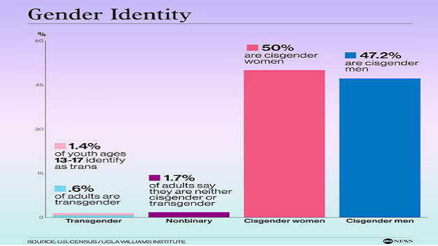 According to the Williams Institute, 1.6 million people aged 13 or older identify as transgender in the U.S. and 1.2 million LGBTQ+ people identify as nonbinary – making up less than .5% and .4% of the U.S. population. The research group has found that the percentage and number of adults who identify as transgender in the U.S. in recent years has remained steady.