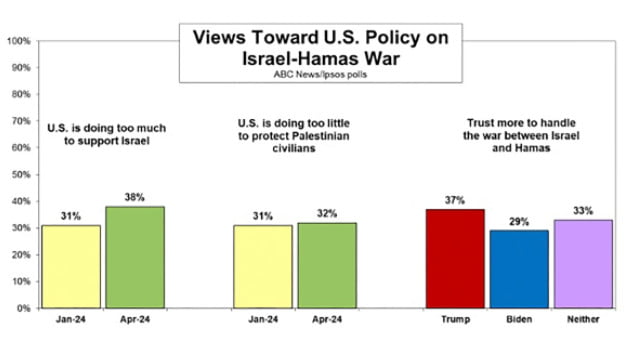 (WASHINGTON) — Nearly four in 10 Americans in a new ABC News Ipsos poll say the United States is doing too much to support Israel in its war with Hamas, up from about three in 10 in January. And more trust former President Donald Trump than President Joe Biden to handle the issue, though few call it critical in their choice of a candidate.