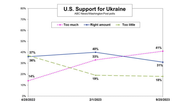 (NEW YORK) — Public concerns that the United States is doing too much to support Ukraine in its war with Russia have notched up in an ABC News/Washington Post poll, even as Ukrainian President Volodymyr Zelenskyy visited the United States in search of additional aid.