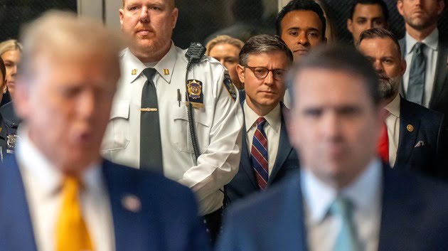Johnson, the highest-ranking Republican in Congress, was in criminal court with Trump on Tuesday morning. After commuting with Trump in his motorcade from Trump Tower, the speaker read a statement in nearby Collect Pond Park where he said he was “deeply concerned” about “this sham of a trial.”