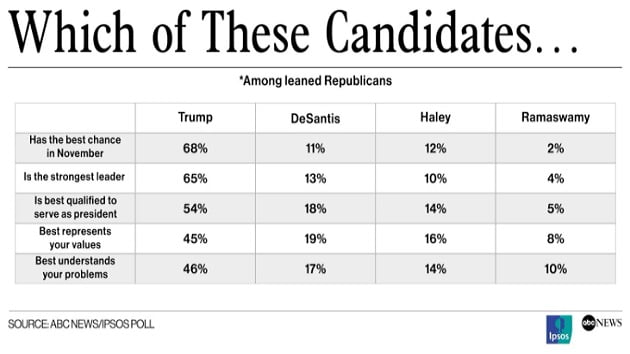 Fewer, but still 54%, say he is the candidate best qualified to serve as president. Fewer than half, 46%, say he best understands the problems of people like them and essentially as many, 45%, pick Trump as the candidate who best represents their own personal values. DeSantis and Haley score in the teens on these measures.