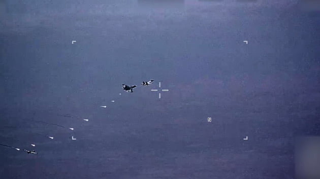 To highlight that behavior, the Pentagon declassified two videos that showed Russian fighter jets dropping parachute flares in front of the drones and one of the jets engaging its afterburners, all actions that led the drones to have to take evasive maneuvers.