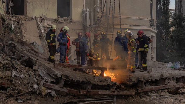 (LONDON) — First responders spent the night in Kyiv digging through the rubble at the children’s hospital and other sites struck by Russian missiles on Monday, Ukrainian President Volodymyr Zelenskyy said.